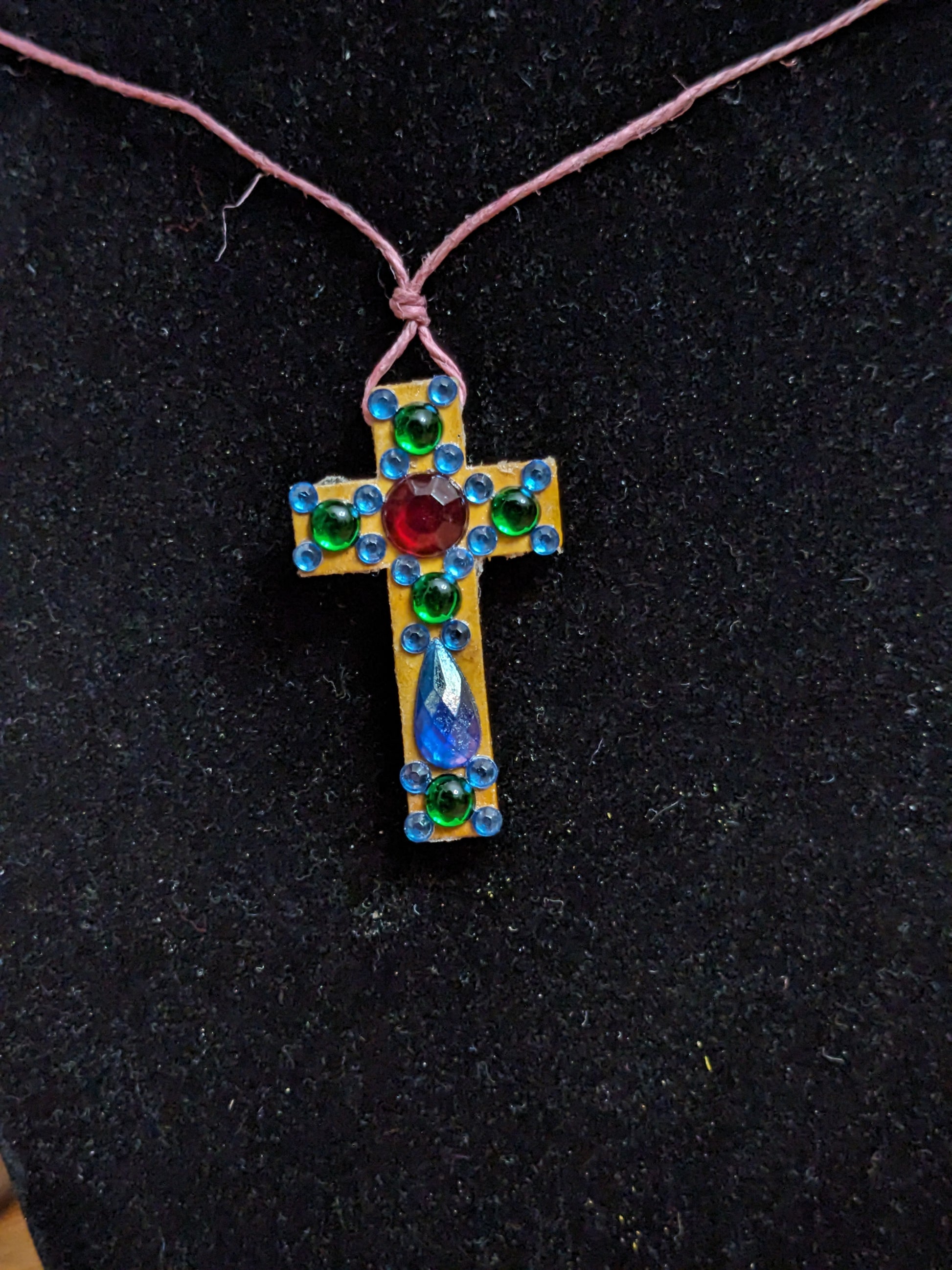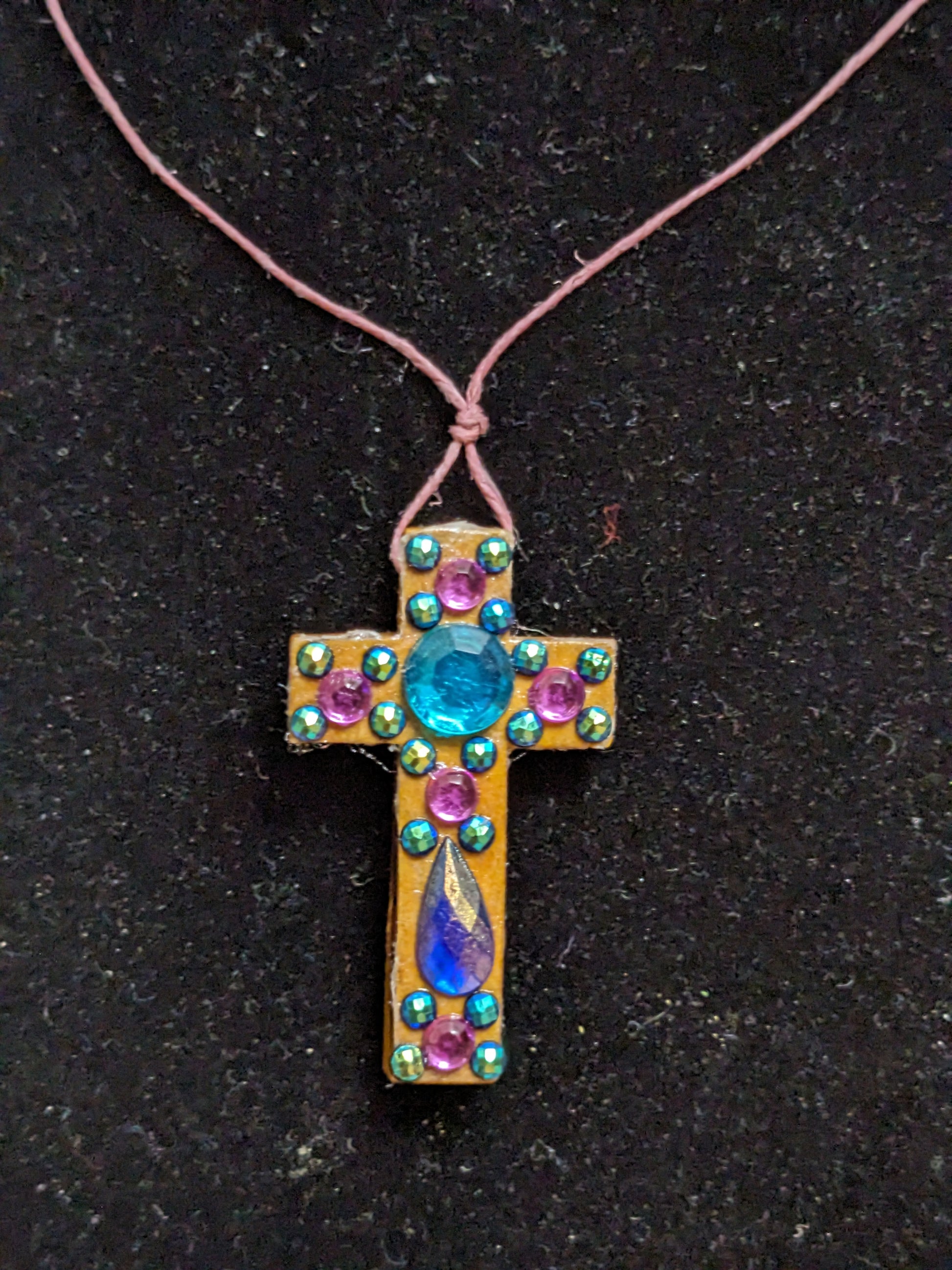 Cross Necklaces on pink adjustable lanyards. The cords adjust from 7 inches to 13 inches